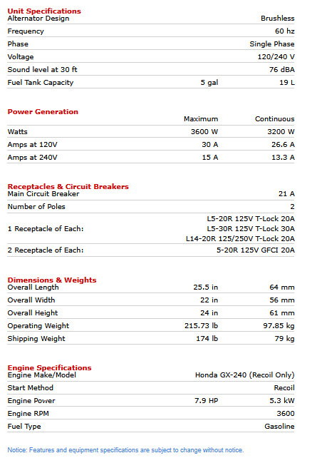 • Powered by Honda GX240 engine with low-oil shutdown and idle control