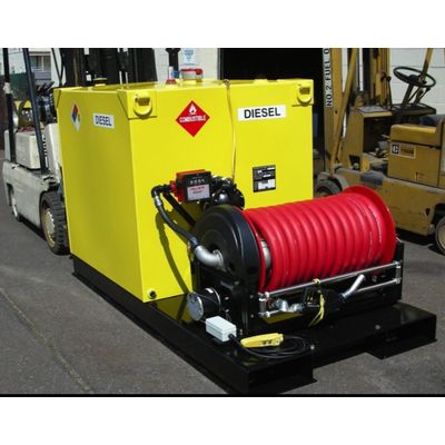 Double wall 500-gallon portable tank with “D” rings, retractable hose reel, pneumatic double diaphragm pump, level gauge and venting. Available for any fuel. Not for highway use. 6’-0” wide by 9’-6” overall length. Overall weight empty is 2,250#, weight full is 6,000#.
