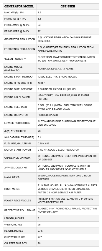 Gillette - Model GPE-75EH -Portable Power Generator