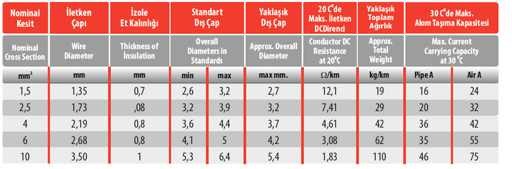 Standards: TS 9758 HD 21.3 S3. VDE 0281-3, BS 6004. Structure: 1- £ multiple copper conductor Applications: Indoor or in dry places, in distribution panels. still. It is used in pipes in facilities and installations.. Technical Specifications: Max. galis/na temperature 70°C, Max.