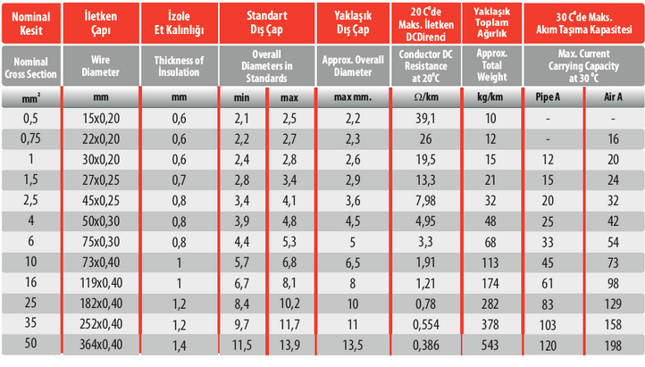 Standards: TS 9758 HD 21.3 S3, VDE 0281-3. BS 6004. Structure: 1-^multiple copper conductor. Places of Use: In closed or dry places. distribution on their boards. pipes in fixed installations and installations. It is used in. Technical Information: Max. operating temperature 70°C, Max. short circuit temperature 160°C.