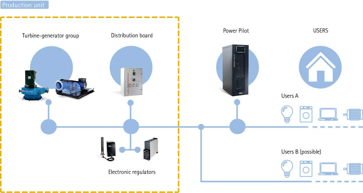 The Power Pilot can be installed upstream of all loads or upstream the only loads that generate the problems outlined below. One typical installation diagram of the Power Pilot inserted between hydroelectric power production unit and users is shown below.