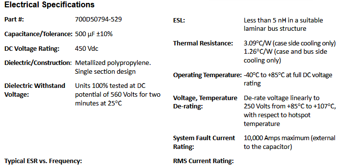 The 700D50794-529 Power Ring is a 450 Vdc, 500 fjF DC Link Capacitor with an ESR of 320 micro-Ohms at 20 kHz and an ESL of less than 5 nH.
