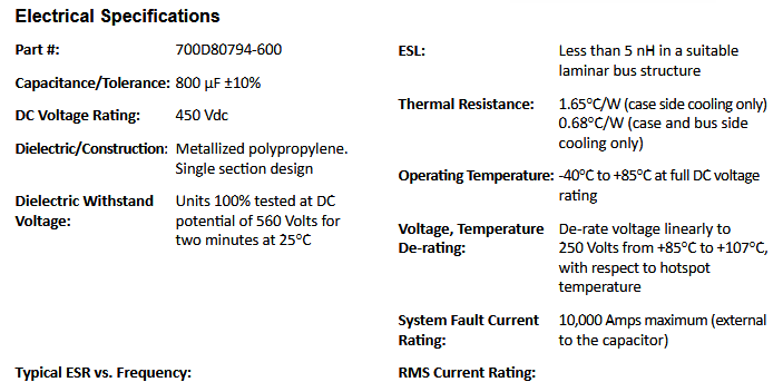The 700D80794-600 Power Ring is a 450 Vdc, 800 fjF DC Link Capacitor with an ESR of 188 micro-Ohms at 20 kHz and an ESL of less than 5 nH.