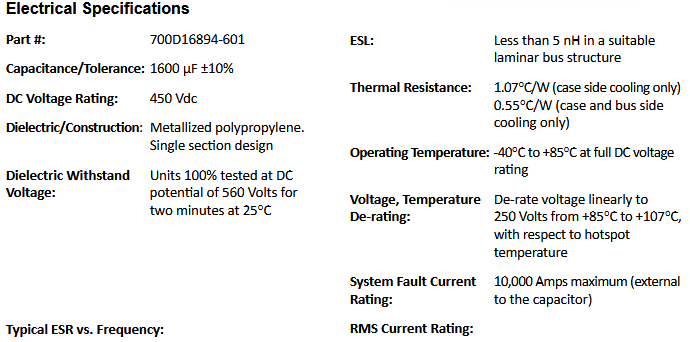 The 700D16894-601 Power Ring is a 450 Vdc, 1600 fjF DC Link Capacitor with an ESR of 98 micro-Ohms at 20 kHz and an ESL of less than 5 nH.