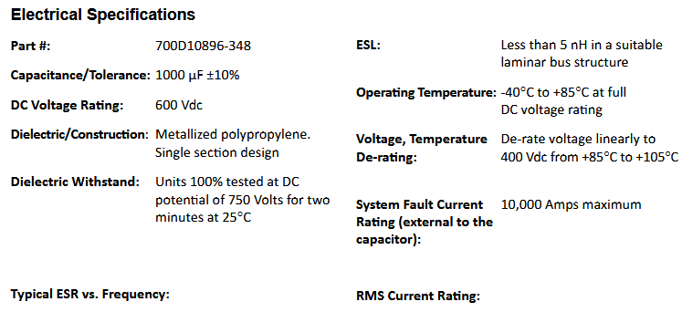 The 700D10896-348 Power Ring is a 600Vdc, 1000 jjF DC Link Capacitor with an ESR of 125 micro-Ohms at 20kHz and an ESL of less than 5nH.