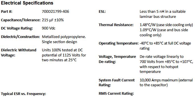 The 700D21799-406 Power Ring is a 900 Vdc, 215 μF DC Link Capacitor with an ESR of 350 micro-Ohms at 20 kHz and an ESL of less than 5 nH.