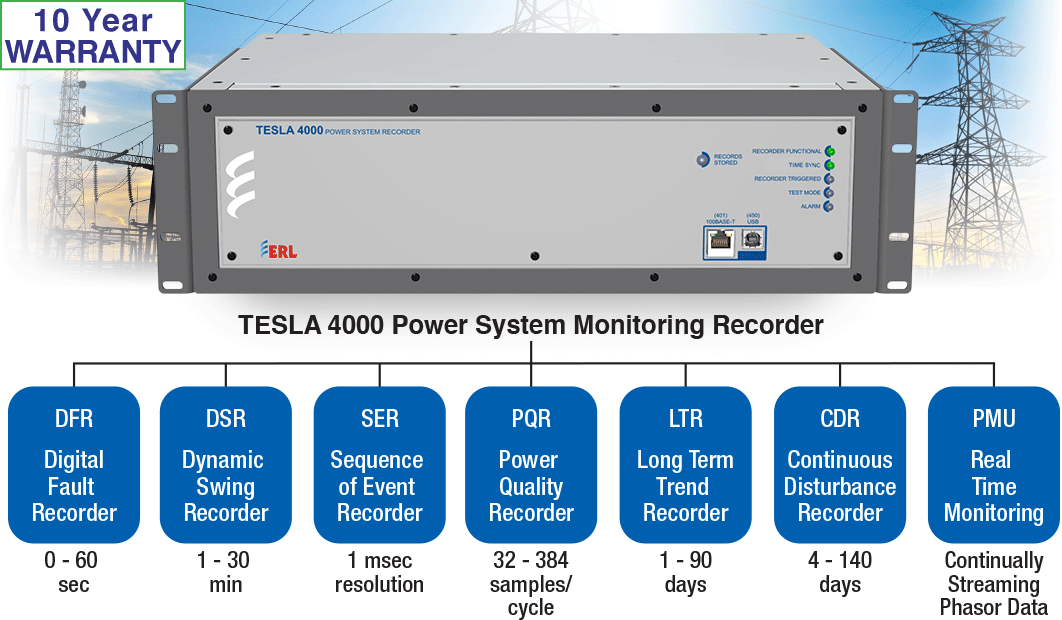 TESLA 4000 Power System Recorder with CDR, PMU and IEC 61850 station bus protocol. TESLA 4000 is an easy-to-use and cost effective, state-of-the-art, multi-time frame (simultaneous) digital fault recorder. Its integrated Phasor Measurement Unit (PMU) functionality streams synchrophasor data for wide area monitoring. Enabled with IEC 61850 protocol, TESLA has advanced communication capabilities that, together with its powerful recording features, provide the most versatile and complete monitoring of power system health.