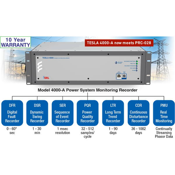 TESLA 4000 Power System Recorder with CDR, PMU and IEC 61850 station bus protocol. TESLA 4000 is an easy-to-use and cost effective, state-of-the-art, multi-time frame (simultaneous) digital fault recorder. Its integrated Phasor Measurement Unit (PMU) functionality streams synchrophasor data for wide area monitoring. Enabled with IEC 61850 protocol, the Model 4000-A has advanced communication capabilities that, together with its powerful recording features, provide the most versatile and complete monitoring of power system health.