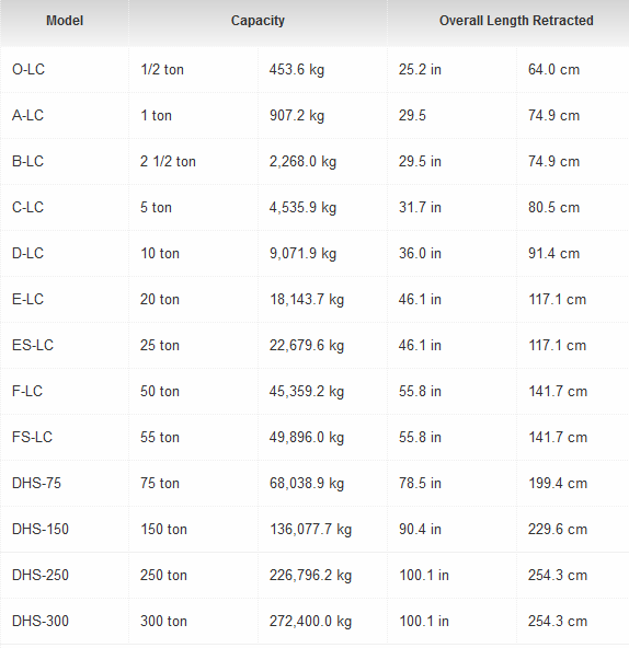 Standard models (O through D) are furnished with an eye-type upper connector and a \\`D\\`-shaped lower connector. Standard models E, ES, F and FS are furnished with \\`D\\`-shaped upper/lower connectors. Standard DHS models (75 through 300-ton) are furnished with shackle-type connector and safety hook lower connector.