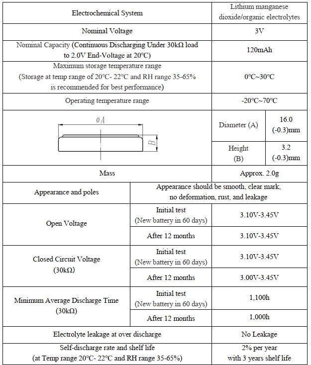 This specification applies to Lithium Manganese Dioxide 3V coin battery model CR1632, made by Tamuz Electronics Ltd. The product is UL1642 approved and meet the standards of GB8897-2008 and EU directive 2006/66 / EC