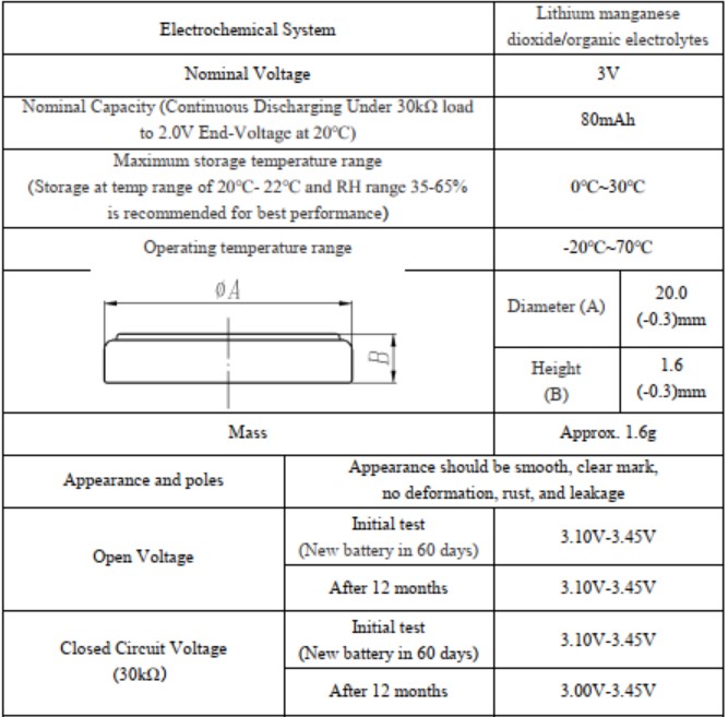 This specification applies to Lithium Manganese Dioxide 3V coin battery model P/N: CR2016-A00 made by Tamuz Electronics Ltd. The product is UL1642 approved and meet the standards of GB8897-2008 and EU directive 2006/66 / EC