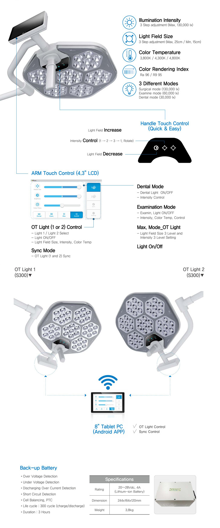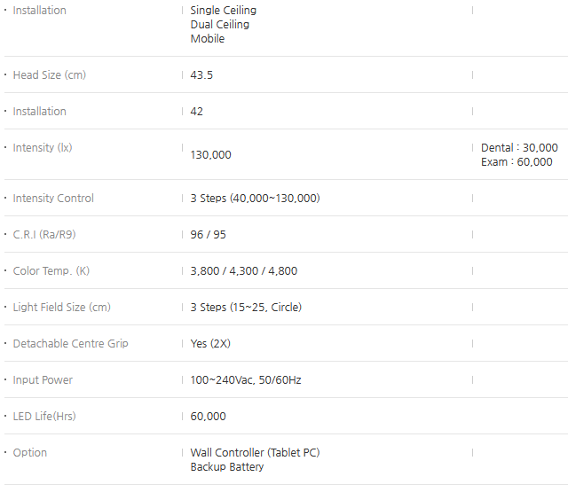 No. of LED(ea): 42. Intensity(LUX): Max 130,000LUX at 1 M. Intensity Control: 3 Steps (40,000~130,000). C.R.I(Ra): 96. Color Temp.(K): 3,800/4,300/4,800. Head size(cm): 43.5cm.