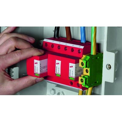 High discharge capacity due to powerful creepage discharge spark gap. Maximum system availability due to RADAX Flow follow current limitation. Easy replacement of protection modules without tools due to module locking system with module release button. Operating state / fault indication by green / red indicator flag in the inspection window. The plug-in protection module can be replaced without the need to de-energise and without removing the distribution board cover.  In multipole protective circuits, we recommend replacing the complete set of protection modules when one module fails.