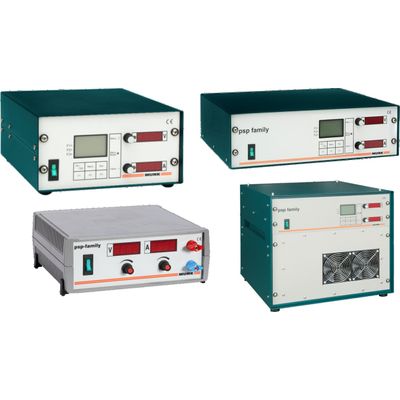 Application: Electroplating Processes, Electro-Polishing, Laboratory Applications, Tampon-Galvanizing, Coating Technology, Pulse Applications. Product Design: The compact and easy to transport PSP boxes are a ready-to-go system. Mains supply can be easily achieved by a socket. The rectifier can be operated via current / voltage control. Equipped with a clearly arranged digital display the rectifier guarantees a good readability. Optional features are programmable Ah-/Amin-/ Asec meters, timers, ramp functions and pulse applications. The air-cooled PSP Family rectifiers are also available as modules and plug-in units.