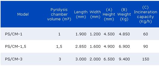 PS/CM series pyrolytic incinerators have been developed by Kalfrisa to guarantee an efficient destruction of cemetery waste. The large dimensions of the pyrolysis chamber allow the introduction of big sized waste without a previous cutting up. The high power of burners permits the calcinations of bone remains.