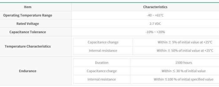 PEC - Radial Type Standard Series: Endurance : 2.7V 65? 1500 hours, Small size, high capacitance and low resistance, Longer cycle life than other secondary batteries.