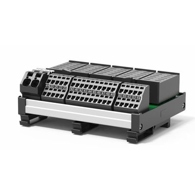 The power distribution system SVS09 is mounted on a symmetrical rail and accommodates 10 electronic or thermal-magnetic circuit breakers. All terminals (line entry DC +24 V, GND (-) for self-supply, load outputs L(+), signalling and acknowledgment) are spring-loaded terminals.