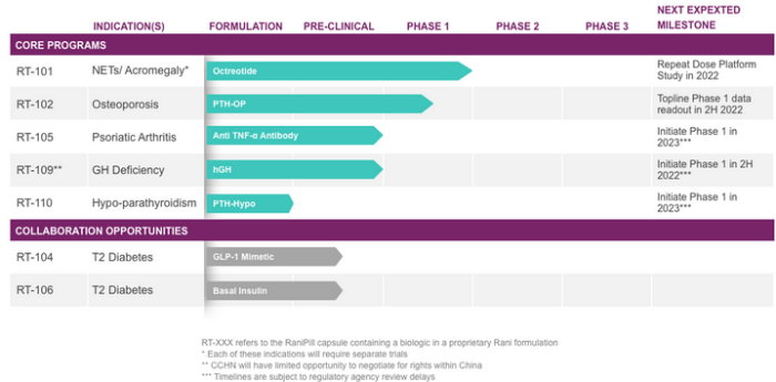 Our pipeline includes five core product candidate programs. Additionally, we envision complementing these core programs with robust partnering activities to maximize the value inherent in the RaniPill capsule. Below is a summary of our product candidate pipeline.