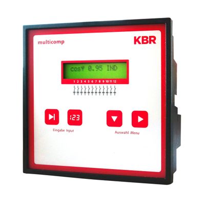 The microcontroller-controlled multicomp F144-xxx-3 records all network data relevant to the control of small systems via A/D transformer inputs. After calculating the required compensation power to achieve the desired target cos φ, the available capacitor stages are automatically switched on or off with a few switching operations. Programming is menu-assisted and is performed with two buttons. System-specific values are stored in a non-volatile memory. Each stage can be switched individually via the built-in manual-0-automatic function.