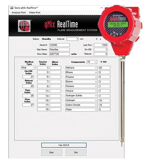 Real-time measurements with thermal flow meters are only made possible by utilizing the power of the evolutionary qMix RealTime App. Based on the NIST library gas database, the App has a library of over 120 pure fluid components with gas properties to create any natural gas or mixture. qMix RealTime App allows for 20 gas components, 20 Modbus fluid composition registers, and the ability to increase accuracy by using AGA-8 density values. Real-time flare gas measurement intervals can be set to every minute, daily, hourly, and weekly.