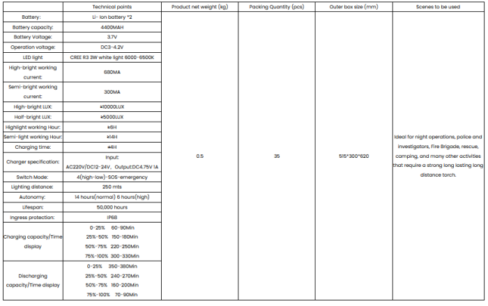 The LED Tactical Power torch is ideal for night operations, police and investigators, Fire Brigade, rescue, camping, and many other activities that require a strong long lasting long distance torch.