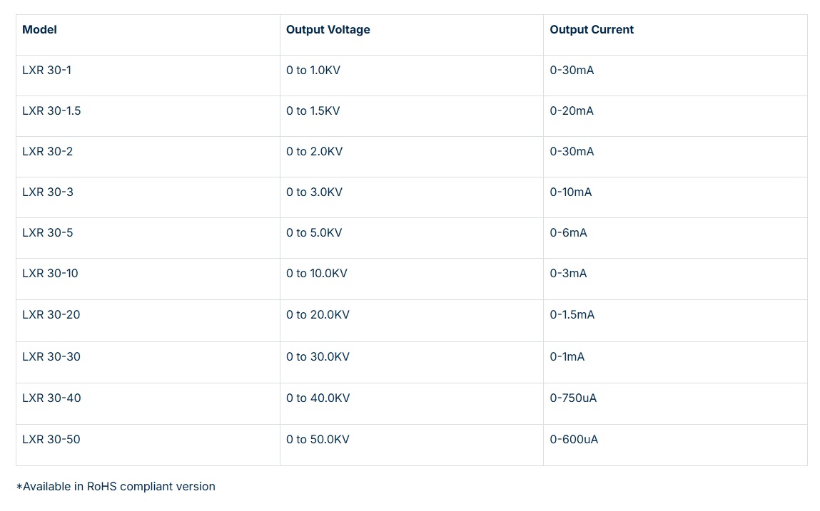 The GAMMA “LXR” series provides a compact, highly stabilized, variable high voltage power source of either negative or positive polarity, with ratings to 50KV and power levels to 30 watts, powered by a 28 VDC* source. The utilization of switch-mode MOSFET technology allows excellent efficiency increasing overall reliability. High-voltage circuits are vacuum encapsulated in a silicone elastomer providing corona free, long-term reliability. Dual control loops allow independent control of both voltage and current where required. All control circuits are ground referenced allowing for ease of interfacing and control. The excellent electrical characteristics of the “LXR” series make it an ideal choice for the most demanding high voltage applications.