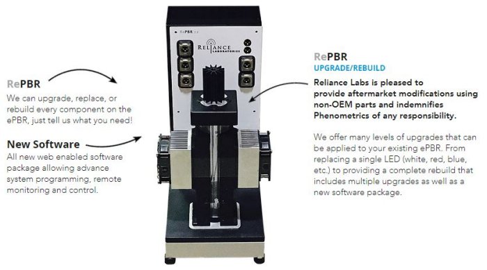 This particular rebuild included: Repairing Thermo Electric (TE) modules, 80 Watts per TE module for a total of 160 Watts per ePBR. New software package, pH System rebuild, including new probe. New LED lighting modules at 4000K and capable of 2,500uE. Independent computer control: of all LED modules, allowing for advanced programming including diurnal cycles.