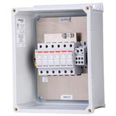 Model RF-6 combiner box that can handle six strings. The box combines and fuses six positive inputs and combines six negative inputs to a single positive output and negative outpu.
