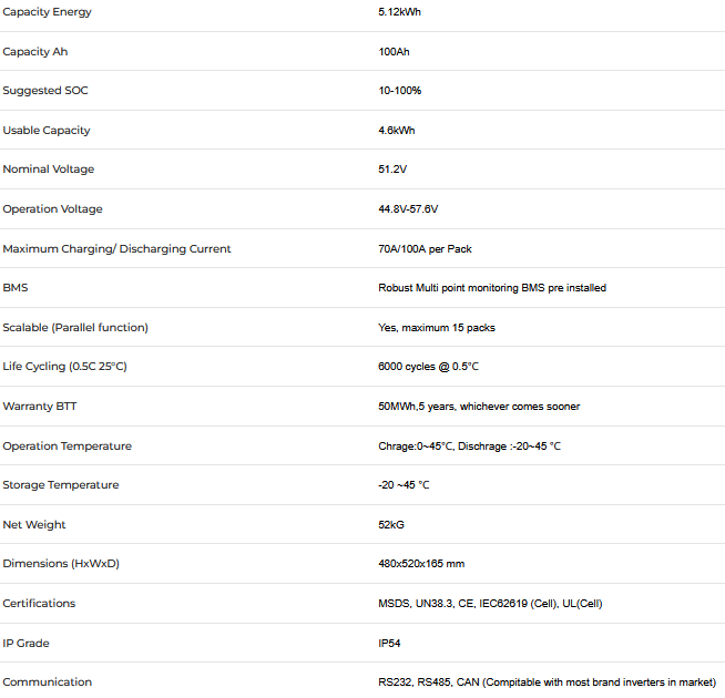 - 51.2V 100Ah 5.12kWh Capacity