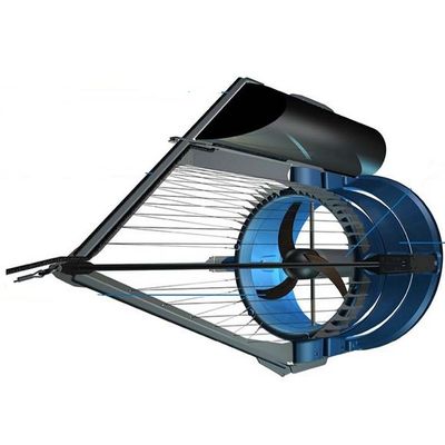 This turbine is designed for rivers, featuring a reinforced debris protection and a patented anchoring system. The anchoring can be done at the bottom of the river, at a bridge support, or at a block on the side of a river.