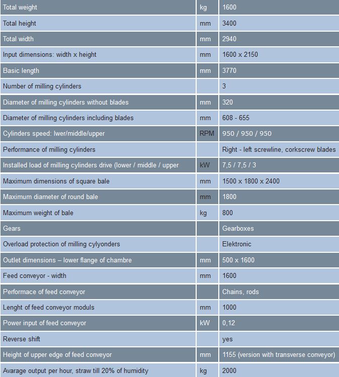 Performance and processing time is dependent on package size and weight, moisture, crop length of the stalk (presses with or without cutting) and movement speed feed conveyor. The main difference of new model is direct drive of every separating cylinder and more than 2 times higher speed of them, now 950 rpm. Drive of down and middle cylinder have 7,5 kW, upper one has 3 kW. Separators in a basic version comes with its own feeding conveyor lenght 3 m. that is possible increse by customer inquiry or add additional conveyor. There is transverse conveyor under the outlet case, that transport separated material to the side of the machine or to the next conveyor, usually ´for transport to another technology.