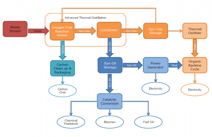 The pyro-gas and pyro-oil can then be sent through generators to produce electricity, some of which can be used to run the plant and the majority exported to the national grid.