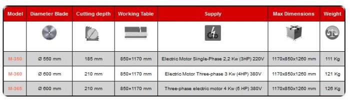 The circular saw with electric motor M-350 is composed by a sliding working plan placed on a stable and robust frame, by a Ø 550 mm disk and by a single-phase electric motor.