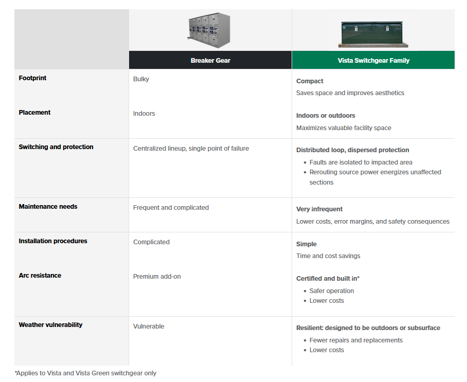 As an engineer, you`ll already be familiar with the basics of Vista switchgear. Like with circuit breaker gear, designing with Vista switchgear is instinctive and straightforward. Unlike circuit breaker gear, Vista switchgear is easy to live with because it is purpose-built for medium-voltage applications. And it has capabilities and advantages that further set it apart: right-sizing your circuits, avoiding downtime, saving valuable space. Get to know the specific differentiators Vista switchgear offers compared to conventional circuit breaker-based systems.