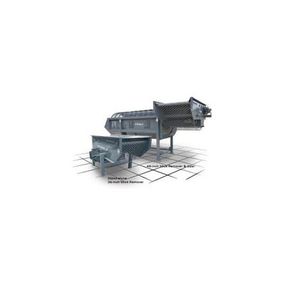 The Stick Remover is available in the three sizes: 36, 48 and 60 inch widths. The discharge conveyor can be oriented to the left or right, and the mounting height is fully adjustable to accommodate almost any cleaning plant configuration. The powerful electric motor is available in single-phase or three-phase versions. The stick remover shown at right is part of a pre-cleaning system that includes a Pre-Vac, the Stick Remover, a Sizer and the Trash Conveyor at the bottom.