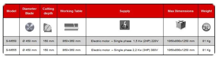 The Rosselli circular saw bench with sliding bench underwent some important changes and improvements over the years. This important evolution makes the Rosselli circular saw bench safer, more reliable and more robust. The S-M650 model is equipped with a 2HP (1,5kW) engine; the S-M655 model is equipped with a 3HP (2,2kW) engine.