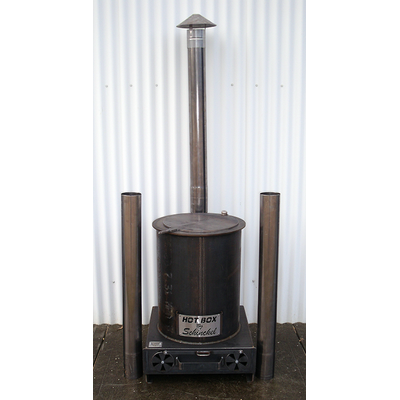 The heavy duty Schinckel Hot Box is perfect for your shed or outdoor living area. The top plate can slide open or can be removed altogether to enable a grill to be used or even a wok. Standing at 800mm high and 500mm diameter , there is no need to chop wood small. 3x 1mtr 4` flue sections with Chinaman`s hat comes standard with this Hot Box. Venting in the ash draw aids in controlling the draw of the fire enabling brilliant radiant heat without the smoke of an open fire. These Hot Boxes are made to Simon`s exacting and professional standards.