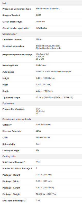Mini circuit breaker, QOU, 100A, 2 pole, 120/240 VAC, 10kA. QOU Miniature Molded Case Circuit Breakers are intended for use in residential and commercial applications. They are used for overcurrent protection and switching on both AC and DC electrical systems. These breakers provide a means to manually open a circuit using the interally magnetic strips. QOU circuit breakers have been verified to adhere to their datasheet specifications by UL and CSA. A range of accessories can be found for these breakers with their product range and are versatitle in their mounting.
