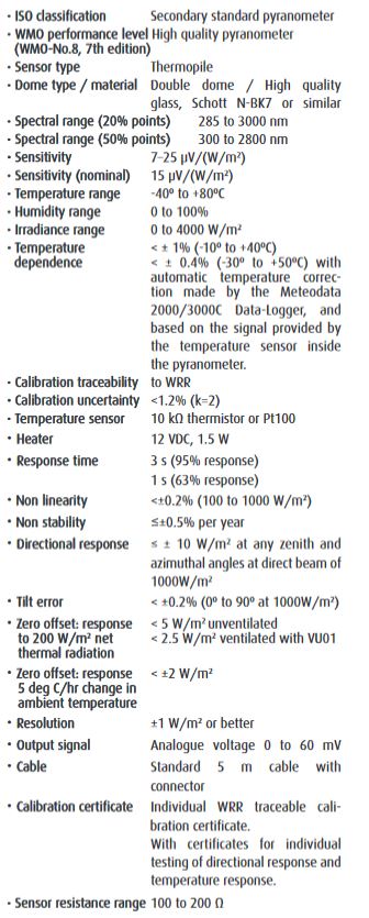 Applicable instrument-classification standards are ISO 9060 and WMO-N0.-8; "Guide to Meteorological Instruments and Methods of Observation". The calibration is according to ISO 9847. PV-related standards are ASTM E2848 and IEC 61724.