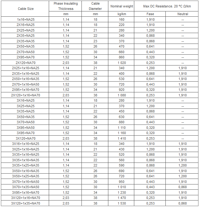 Operating voltage: 0.6/1 kV. Operating temperature: 90°C. In emergency conditions: 130°C. Installation: secondary distribution. Cable Size: from 16 mm2 Up to 120 mm2. Under short circuit conditions: 250°C. Identification: the conductors shall be identified by ribs or edges extruded longitudinally over the insulation.