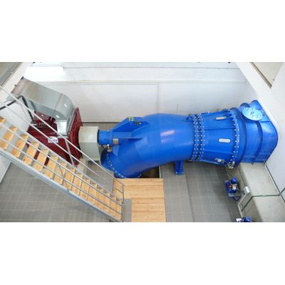 Regulation of the runner with runner blades fixed. Is the most frequently used machine for newly constructed small head hydropower plants. It is also used in the renovation of older plants originally equipped with vertical Francis turbines, which often achieves a better flow usage. The advantage is the low cost of the equipment. Installation is ether with a drive belt or directly connected to the generator. To shutdown of the turbine gravitational plate closing on the input is used.