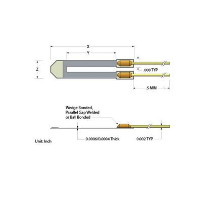 Part Number: SS-047-025-1000-PU. Dimension Z: 0.016”. Lead Type: Welded AU 2.0 mil. Thickness: 0.0004”. Resistance @ 78 deg F: 1000 ± 100 Ohms. Gage Factor: 160 ± 10. TCR*: --20%. TCR*: 28%. Standard Semiconductor Strain Gages are made from "P" doped bulk silicon. They have no P/N junction. The Silicon is etched to shape, eliminating the potential for molecular dislocation or cracks, thereby optimizing performance.