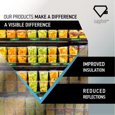 Refrigerated cabinets covered with Sapphire anti-reflective products are energy efficient and make it easy to see the products on display. By combining Anti-Reflective coating with Low-emissivity glass, we have created the lowest reflection % in combination with the lowest U-value of any glass on the market. This makes the glass virtually invisible and also energy efficient. The final glass products have a smooth and durable surface for much easier handling and processing for any food display design.