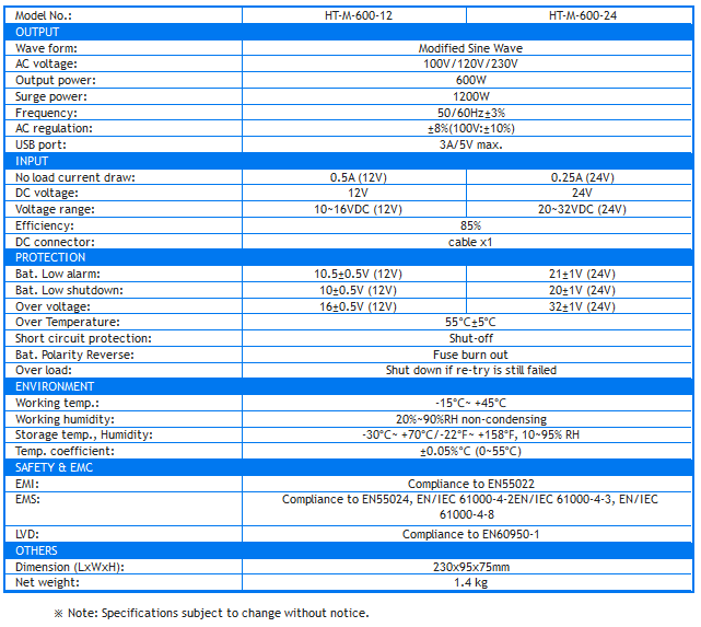 Design feature: Compact size and light weight. Re-start function.Complete protection design. With USB power port. (5V / 3A max.). 6cm thermal control fan.