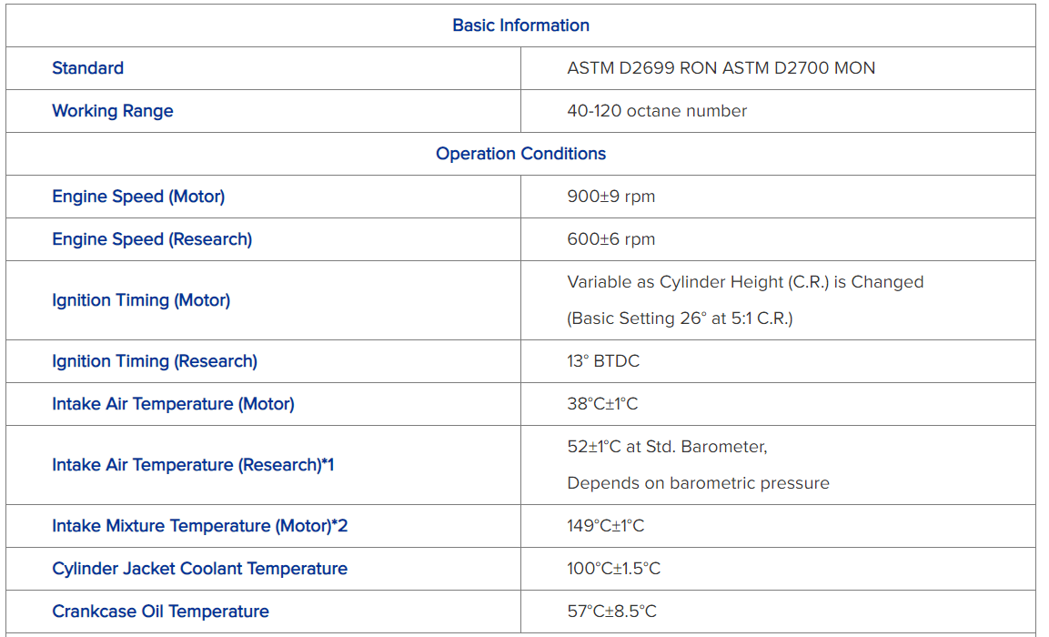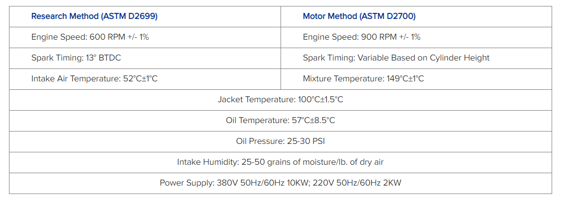 - Parameters are adjustable via operating panel according to ASTM D2699(RON) and ASTM D2700(MON) test method specifications.