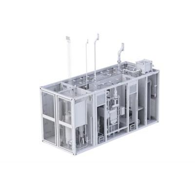 The HGas1SP Plug&Play product includes a single ITM Power high-efficient PEM electrolyser stack alongside all the necessary sub-systems required to produce high-purity, self-pressurised hydrogen gas. The MEP1 is rated at ~0.7MW start of life (including all sub-systems) and is able to produce ~270kg of hydrogen per day. The fully integrated turn-key system is packaged in two separate ISO containers. The Electrolyser container includes the electrolyser stack, process equipment (including water clean-up), hydrogen purification and a PLC control system. The Power Supply container includes power distribution within the equipment and rectifiers for the electrolyser stacks.