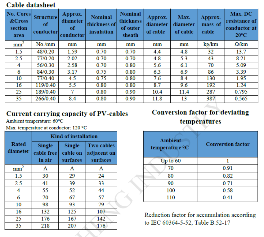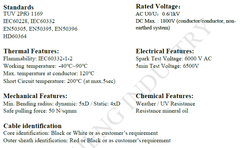 Solar cables applies to flexible single-core cables (cords) for use at the DC-side of photovoltaic systems with a maximum permissible voltage of DC 1.8kV (conductor/conductor, non-earthed system).