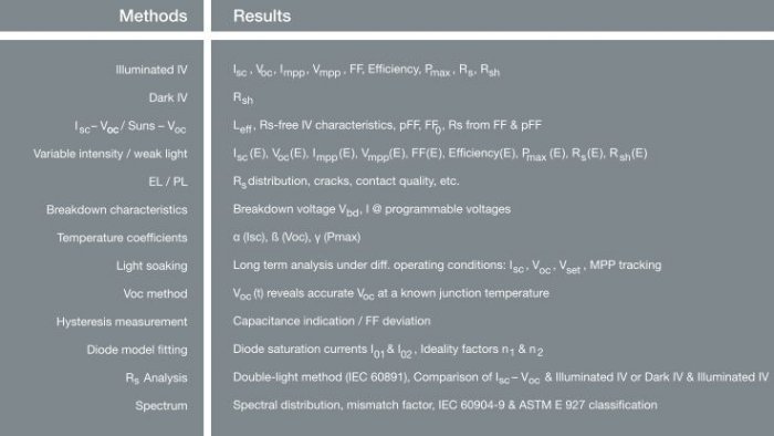 Single source & multi-zone solar simulation. Combines various measurement methods in a single instrument. Automated sample loading / unloading. Customized contacting systems. Programmable measurement sequences. Bifacial illumination option. Sample temperature control.