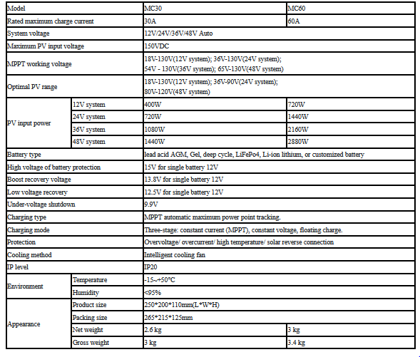 Mile - Model MPPT - 60A 12/24/36/48V -Solar Charge Controller